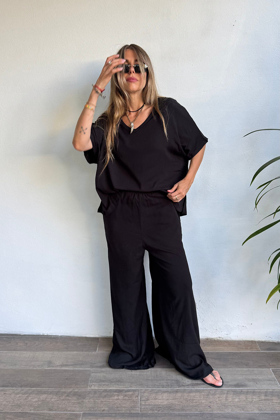 Remerón en seda fría, que es un tejido de punto livianito y muy cómodo proque estira en ambos sentidos. Es de nuestros Remerones comodín, que ademas de ser mega cómodo queda bien con todos los outfits que armes con el. Hicimos el palazzo en el mismo print para que te jueges a usarlo como monolook.