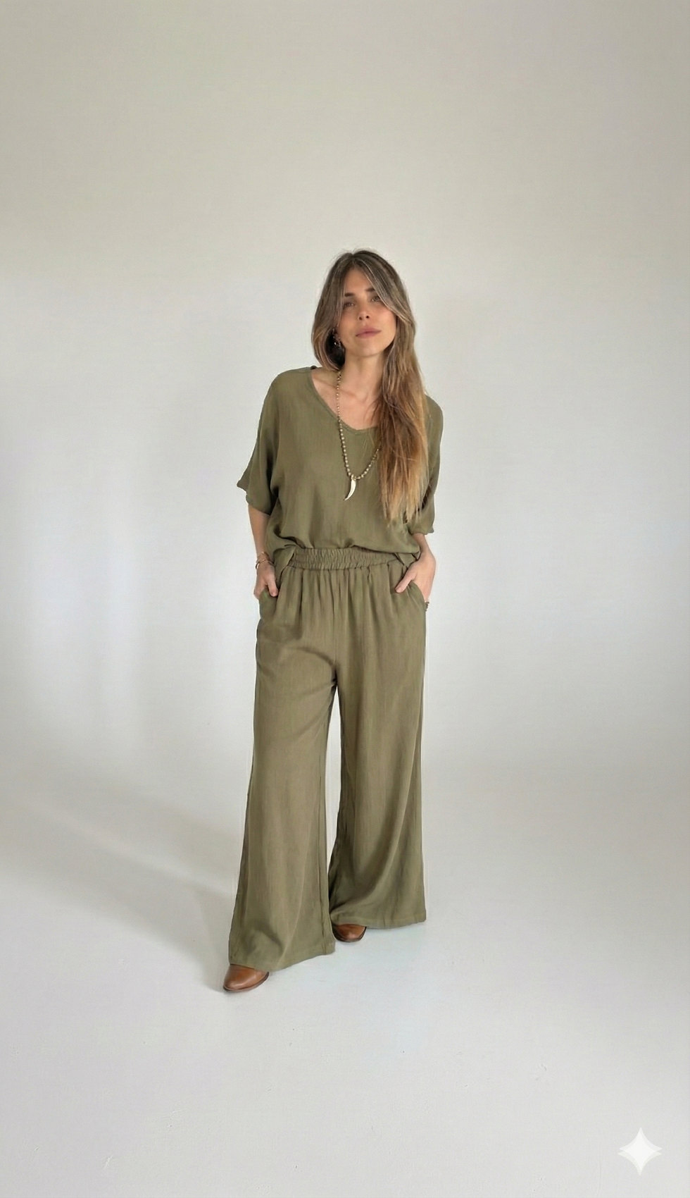 Este remerón es la definición de frescura y elegancia en lino. Su combinación monocromática y corte en V crea una silueta distendida y sofisticada. Ideal para eventos al aire libre, días de verano semiformales o tambien reuniones informales, este conjunto ofrece una estética moderna y cómoda.